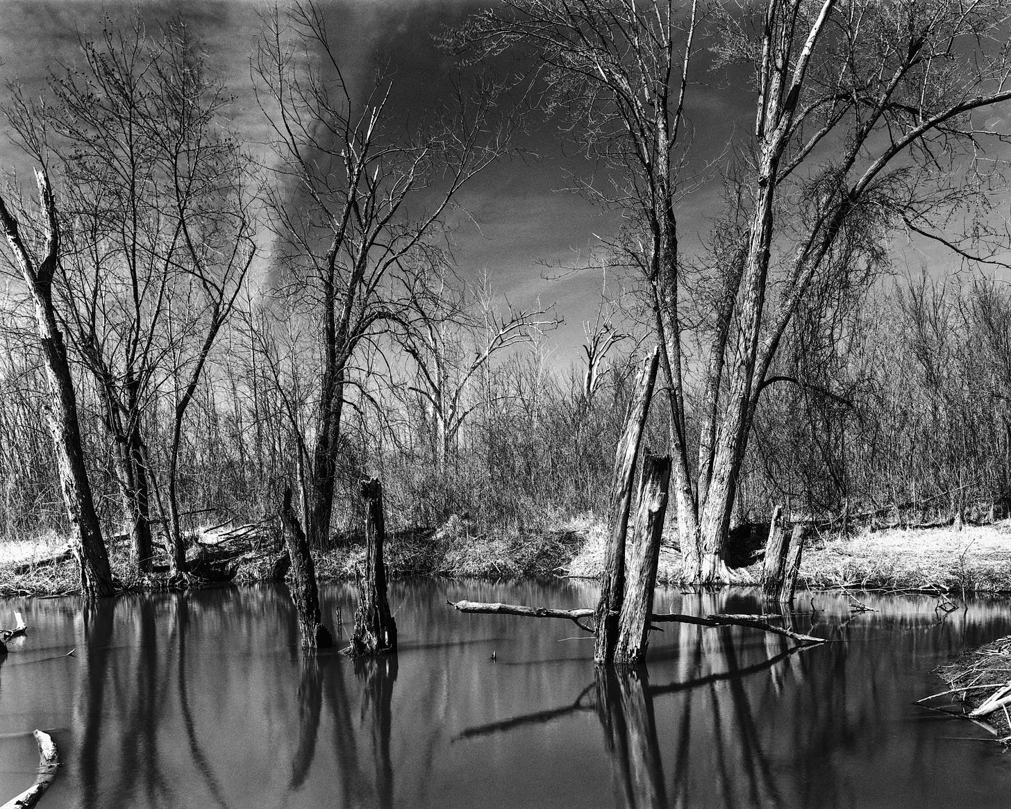 I ran out of the path at a lovely area with a small area of open water dotted with the relics of dead trees killed by the frequent floods. I made two exposures. One was marred by me mistakenly putting my filter holder on poorly, allowing light to leak in on one side. The resulting negative looked like it had a massive lens flare across it. Thankfully, I framed a second composition, and it turned out to be the keeper of the day.